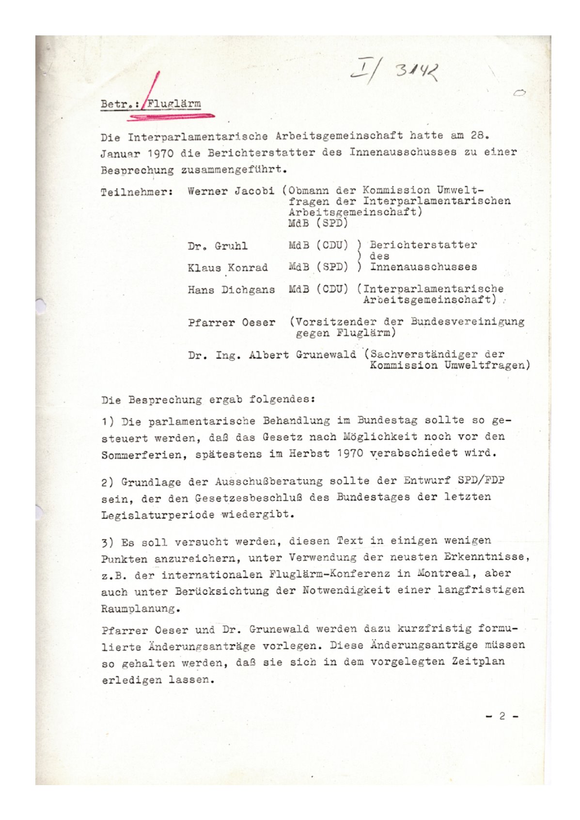 Kurzprotokoll über eine Besprechung der Berichterstatter des Innenausschusses zum Fluglärm, 28.01.1970